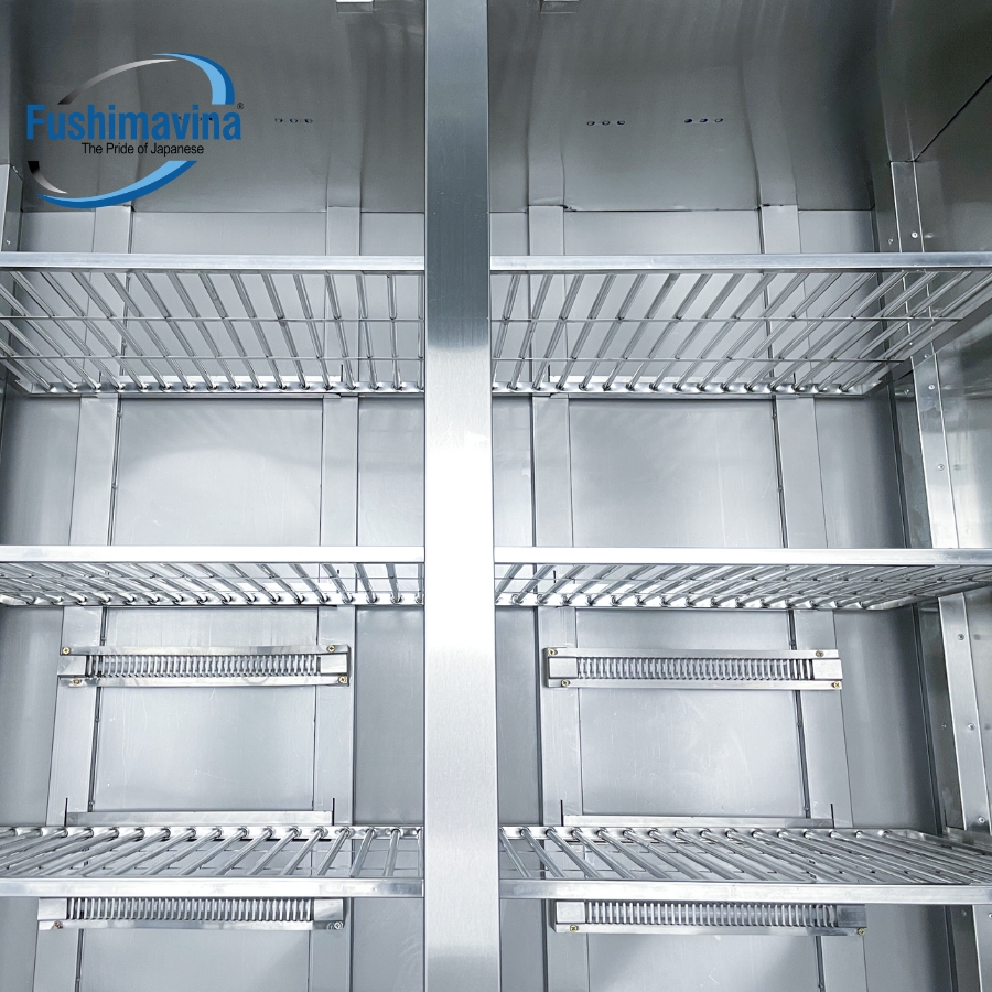 Cánh kính đôi, 2 lớp inox, 1 lớp bảo ôn đổ xốp 2 thành phần.